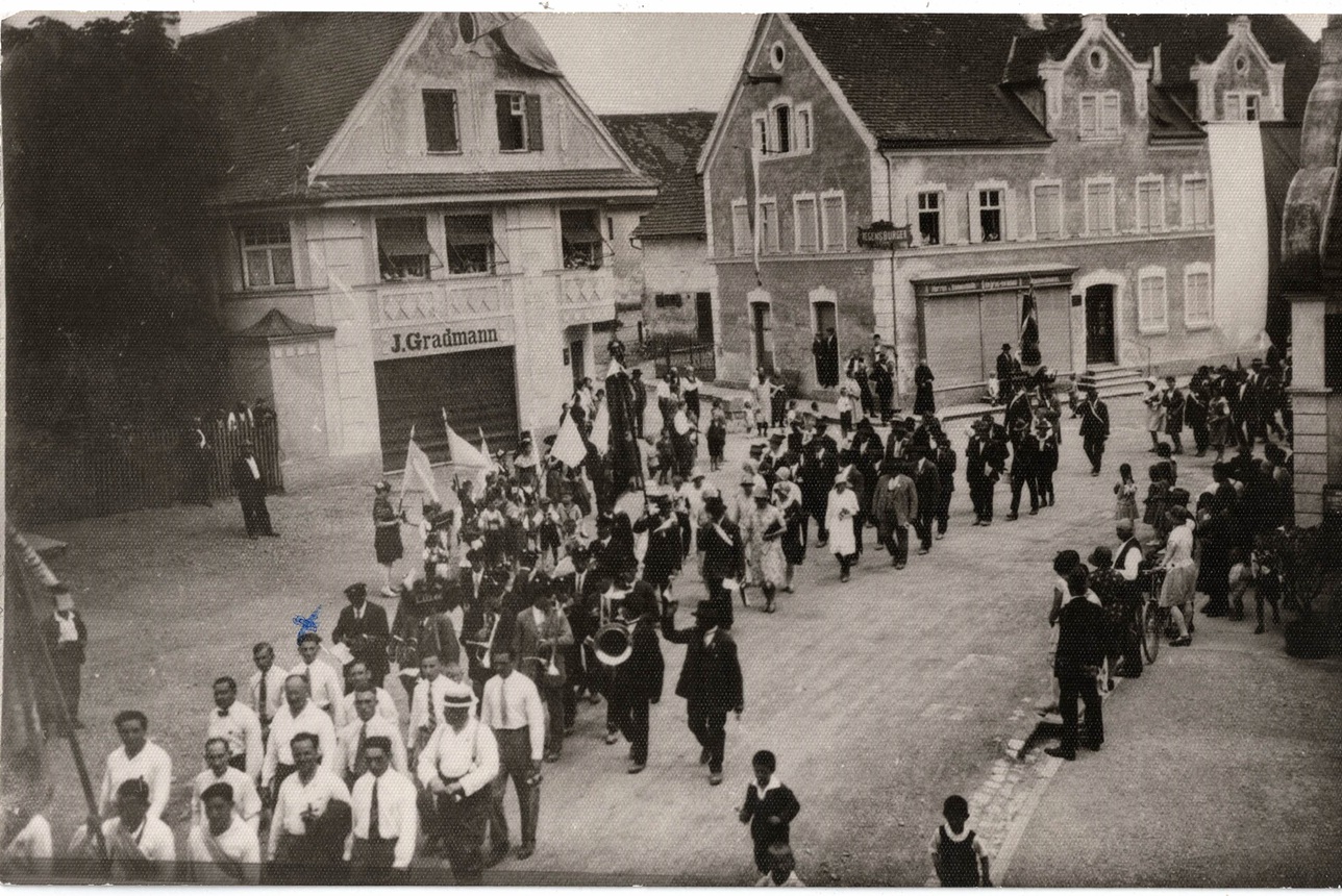 Foto: Die Bildrechte liegen beim Stadtarchiv in Ichenhausen, die uns diese freundlicherweise eingeräumt haben. Das Foto stammt aus dem Nachlass M. Schmid, der Fotograf war Hans Schendel. Das Bild zeigt den Gesangverein Zion beim Umzug anlässlich des Schützenfests 1931 in Ichenhausen.